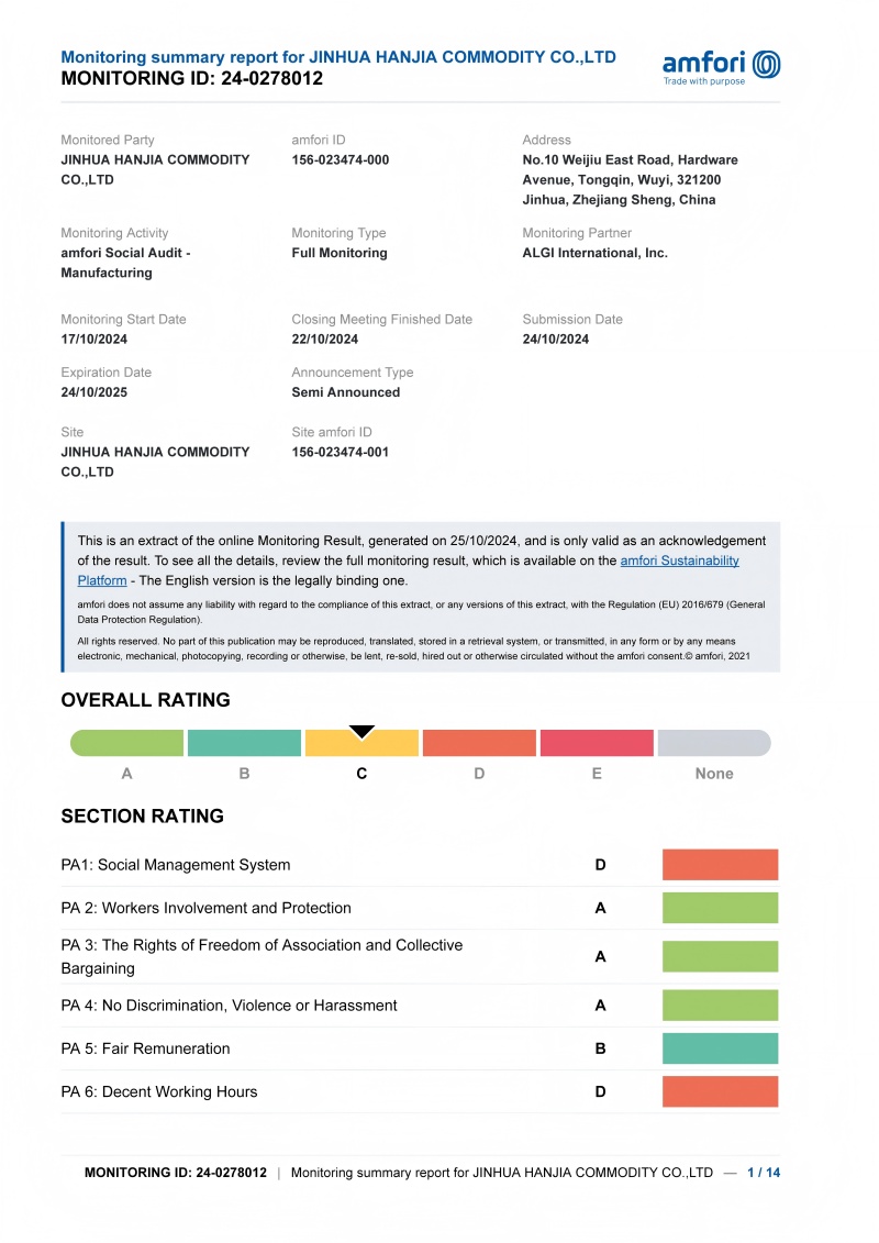 জুলাই 2025 সালে,জিনহুয়া হানজিয়া কমোডিটি কোং, লিমিটেডসমবায় ইউনিয়ন এনসেইগন দ্বারা নিযুক্ত তৃতীয় পক্ষের ইউরোপীয় পরিদর্শন সংস্থা কর্তৃক পরিচালিত আন্তর্জাতিক শ্রেণিবিন্যাসের জন্য স্ট্যান্ডার্ডস (আইসিএস) কারখানার নিরীক্ষণ প্রোগ্রামে সফলভাবে একটি সি-লেভেল শংসাপত্র প্রাপ্ত হয়েছে। এই শংসাপত্রের ব্যবস্থায় চারটি স্তর রয়েছে: এ, বি, সি এবং ডি। ফরাসি চেম্বার অফ কমার্স অ্যান্ড ইন্ডাস্ট্রির (এফসিডি) সদস্য হিসাবে সংস্থাটি আন্তর্জাতিক শ্রম সংস্থার সামাজিক পরিচালন প্রকল্পের স্ট্যান্ডার্ড SA8000, তার সরবরাহকারীদের উপর সামাজিক দায়বদ্ধতার নিরীক্ষণ বাস্তবায়ন করে।