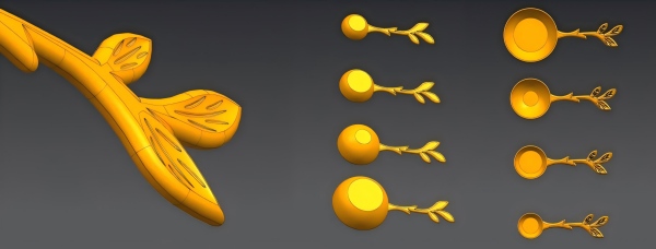 প্রথমত, পূর্বের অভিজ্ঞতার উপর ভিত্তি করে পণ্যের আকৃতি এবং সম্ভাব্য ব্যবহারের মূল্যায়ন জড়িত। প্রাথমিক উপাদান হিসাবে জিঙ্ক খাদ ব্যবহার করে, আমরা উপাদানের ঘনত্ব এবং পৃষ্ঠের বৈশিষ্ট্যগুলি গণনা করেছি, এরগনোমিক্স অন্তর্ভুক্ত করেছি এবং চারটি পরিমাপকারী চামচ বা বরফের চামচের জন্য সামগ্রিক মাত্রা ডিজাইন করেছি। পরবর্তীতে, আমরা প্রতিটি ছোট-বড়-ভিত্তিক বিশদ পরিমার্জন করেছি এই মাত্রার উপর।